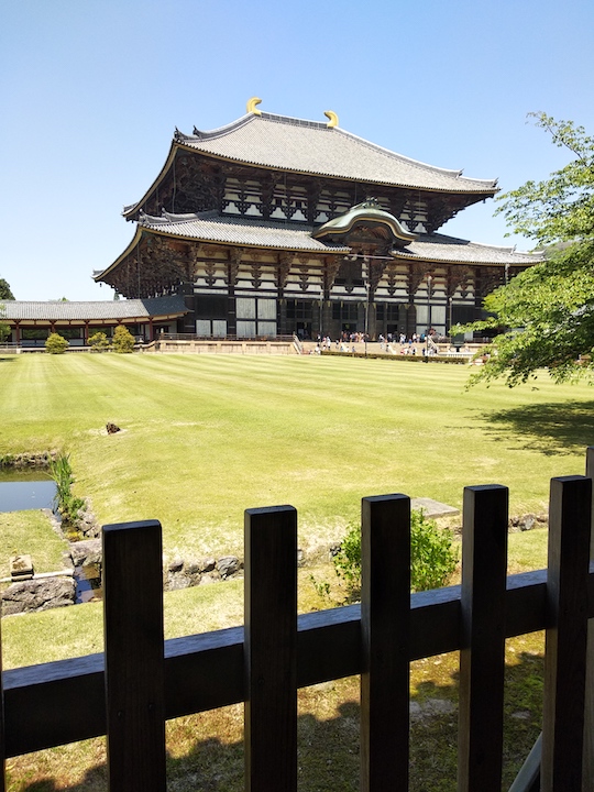 After a 45-minute journey, we reached Nara station. Gathering enough info from the tourist information counter, we set out to see the deers in and around Todaiji Temple and the famous Buddha shrine. The UNESCO World Heritage Site was a sight of awe and admiration. The 50 meter tall shrine of Buddha was more close to heart, after the briefing by our guide, Taka. Taka, a nice gentleman who appeared to be in his late 50s or more, took us around the place and explained the history of the temple. From him, we learnt that Nara was once the capital of Japan, and that the stone pavement in front of the temple had a story, and also that India was a dominant part in the shared history of the two countries.
